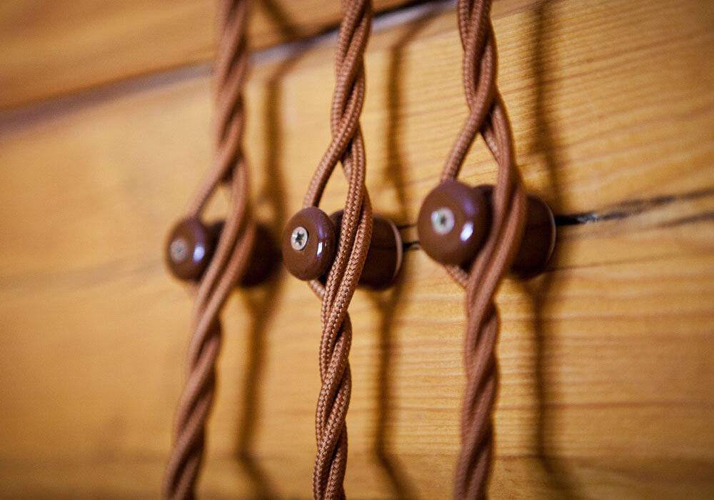 В связи с этим, владельцы деревянных строений, отдают предпочтение наружной проводке. Она не только придает помещению эстетичный вид, но и повышает степень пожарной безопасности. Ведь древесина горит похлеще остальных строительных материалов, и если загорится внутренняя проводка, то дом не спасти. Открытая система с витой проволокой исключает прямое воспламенение и может спасти жильцам и сохранить домашний очаг в целости и сохранности.